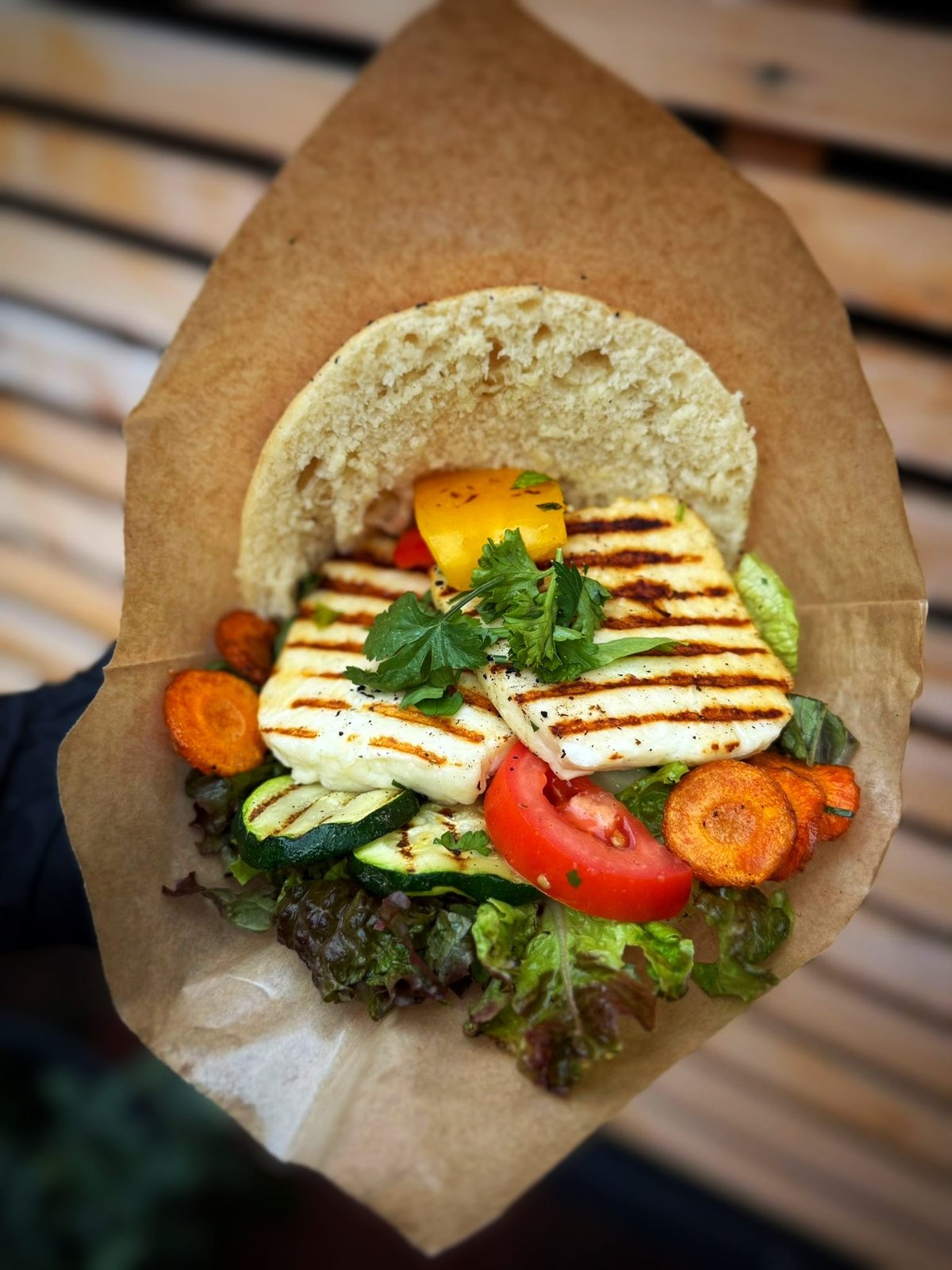 Halloumi sýr, grilovaná zelenina, salát, rajčata, nakládaná cibule, čerstvé bylinky, kyselé okurky, feta sýr, pita chleba