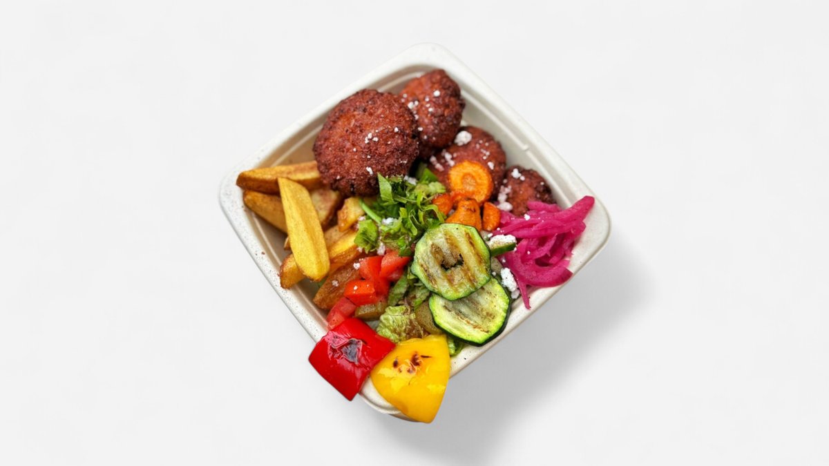 Domácí Falafel, Grilovaná Zelenina, Salát, Rajčata, Nakládaná Cibule, Čerstvé Bylinky, Kyselé Okurky, Feta Sýr, Hranolky Nebo Rýže