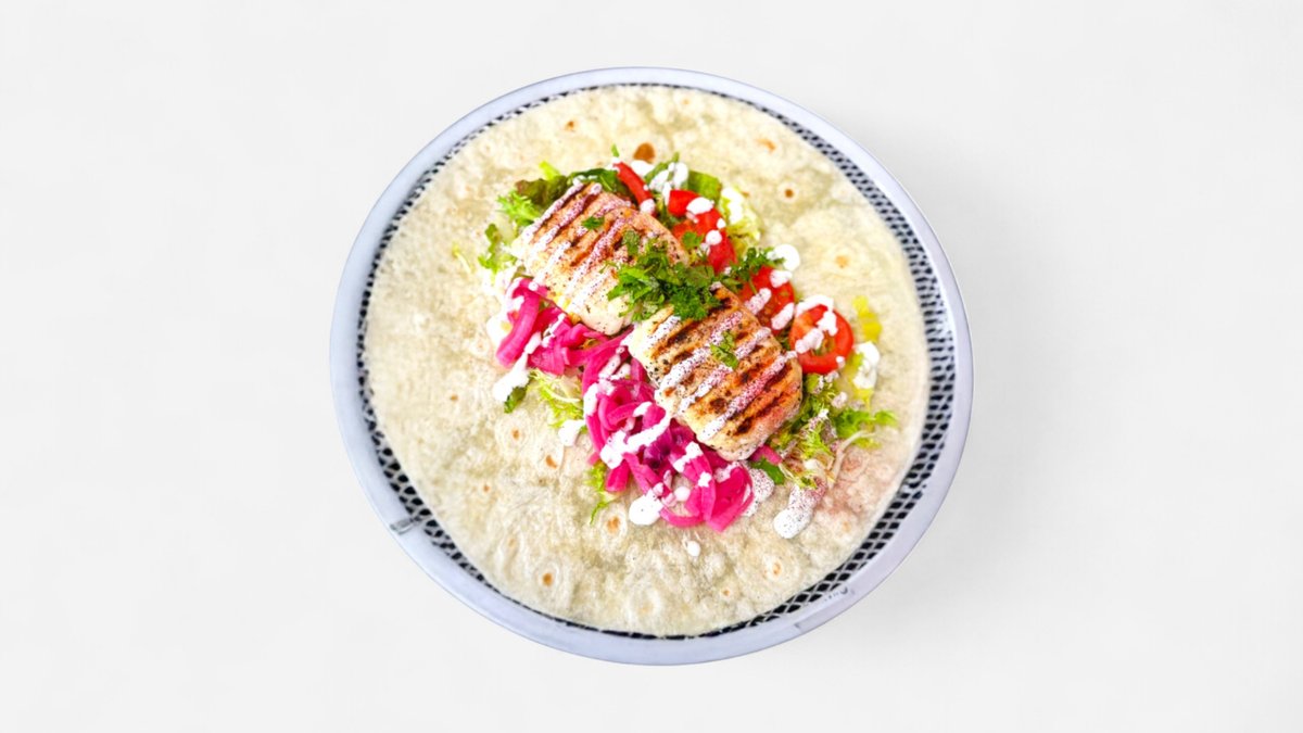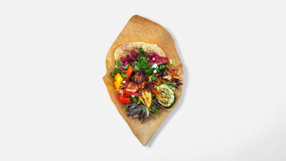 Kuřecí Stehna, Grilovaná Zelenina, Salát, Rajčata, Nakládaná Cibule, Čerstvé Bylinky, Kyselé Okurky, Feta Sýr, Tortilla zobrazit více