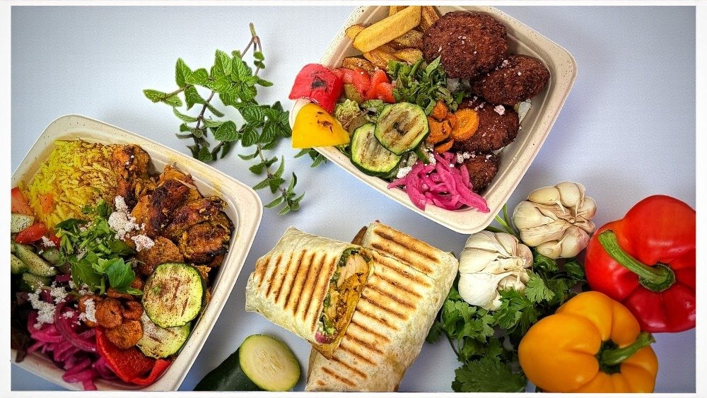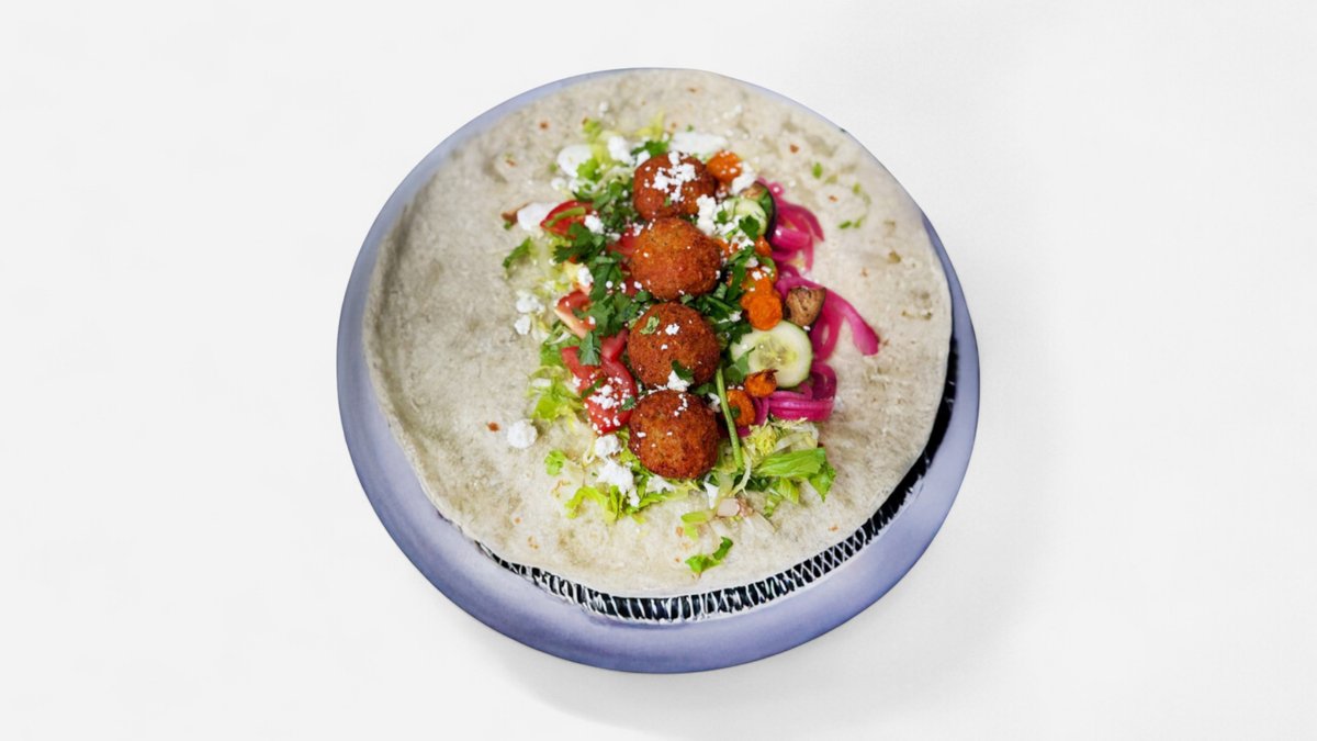 Domácí Falafel, Grilovaná Zelenina, Salát, Rajčata, Nakládaná Cibule, Čerstvé Bylinky, Kyselé Okurky, Feta Sýr, Tortilla