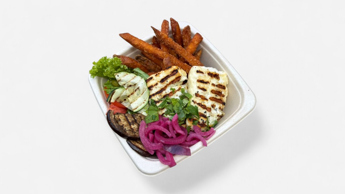 Halloumi Sýr, Grilovaná Zelenina, Salát, Rajčata, Nakládaná Cibule, Čerstvé Bylinky, Kyselé Okurky, Feta Sýr, Hranolky Nebo Rýže