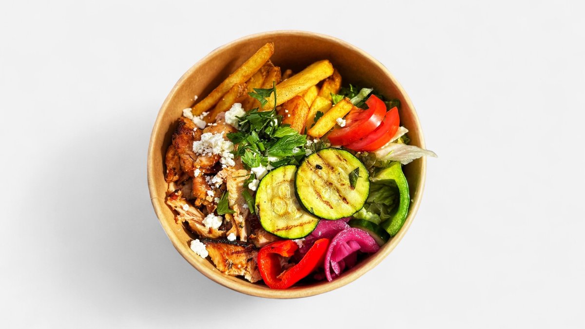Kuřecí Stehna, Grilovaná Zelenina, Salát, Rajčata, Nakládaná Cibule, Čerstvé Bylinky, Kyselé Okurky, Feta Sýr, Hranolky Nebo Rýže