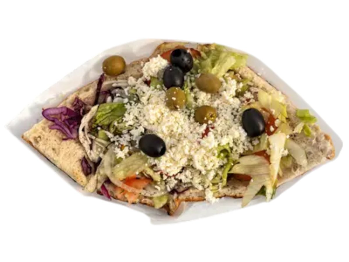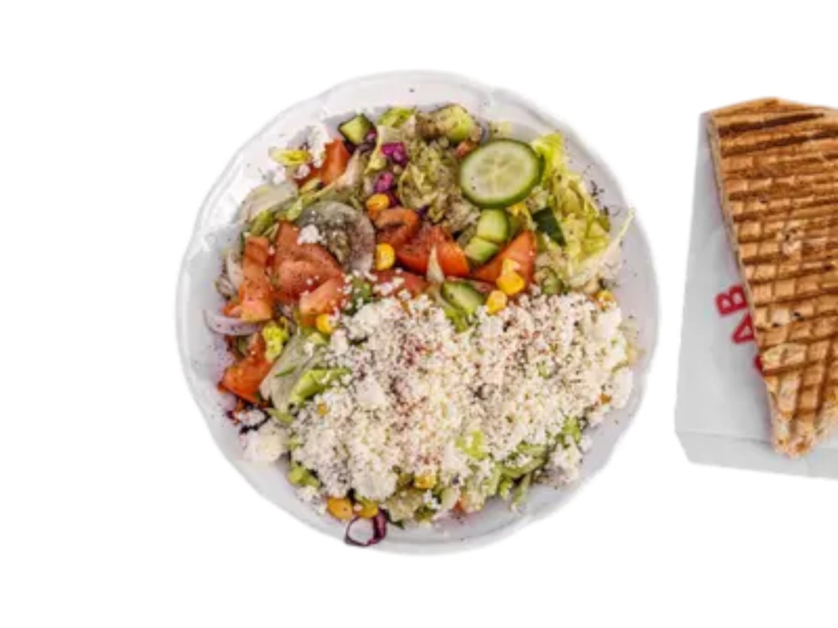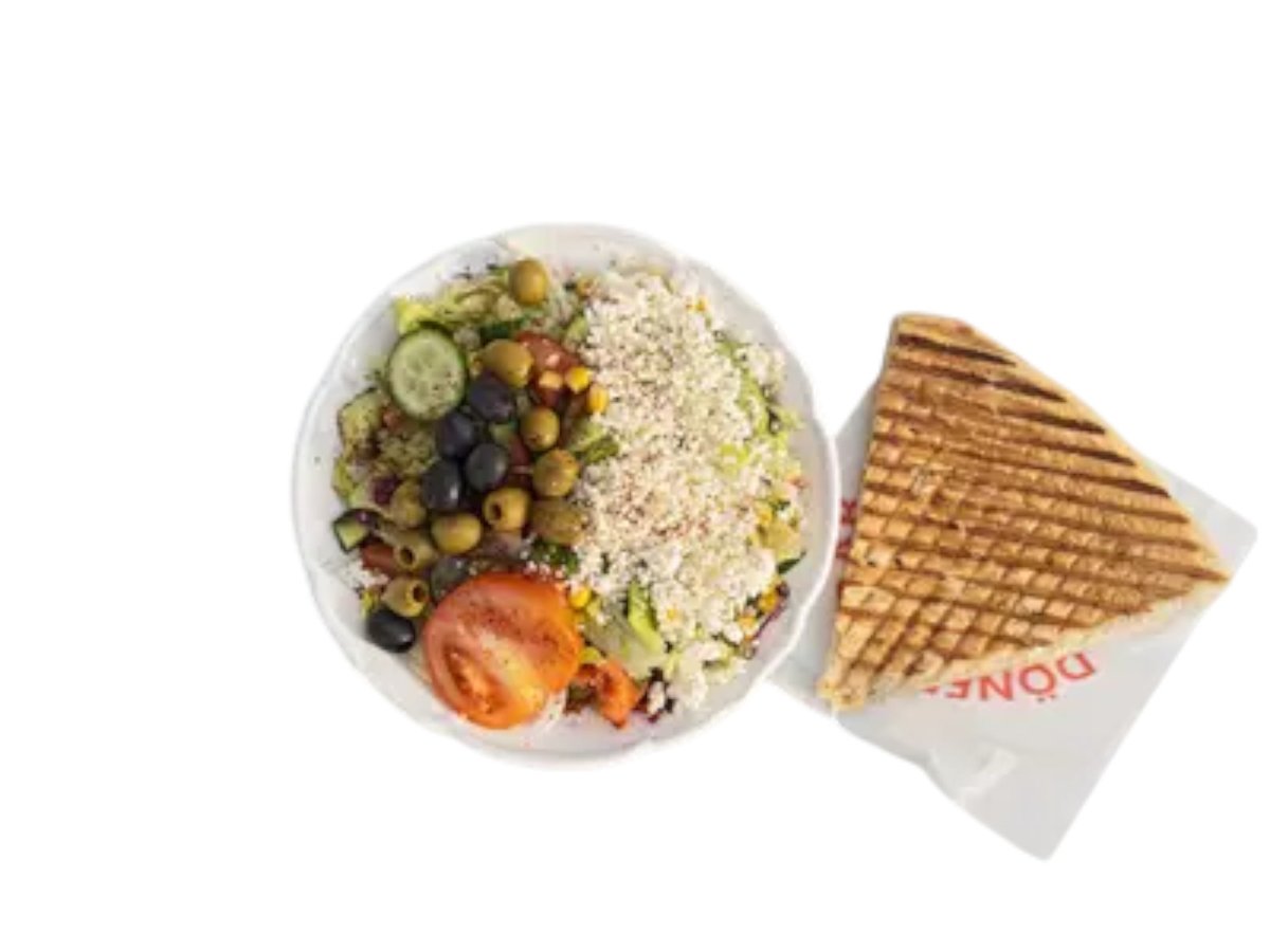 Salát + sýr + olivy + omáčka + turecký chléb