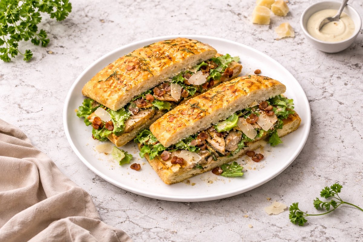 domácí focaccia naplněná kuřecím prsem (120 g) v panko strouhance s citronovou kůrou, římským salátem s caesar dresingem a parmezánem