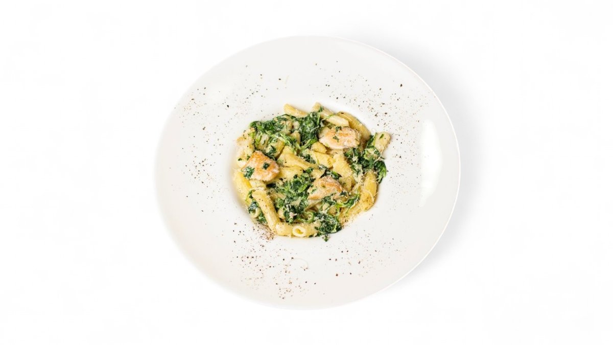 bílá omáčka, kuřecí maso, špenát, česnek, parmazán