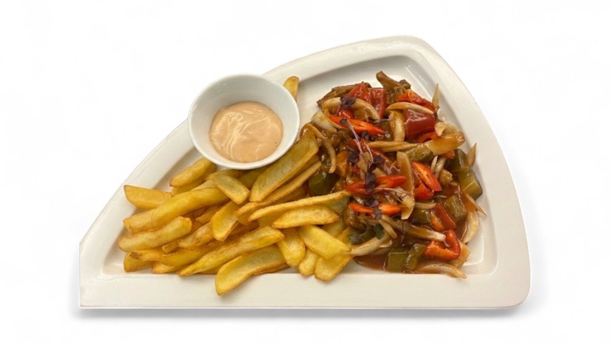 Pikantní směs z marinované vepřové panenky (šalotka, paprika, okurky, chilli, rajčata), smažené dipper fries a grilovací dresink.