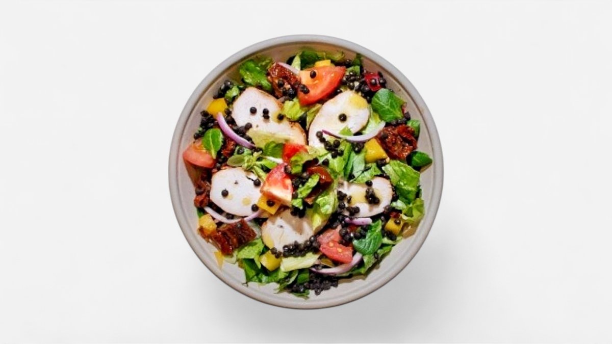 Kuřecí maso, římské listy, rajče, Gran moravie, červená cibule, sušená rajčata, baby špenát, paprika mix, černá čočka + dresink dle výběru. Hmotnost 420 g.
