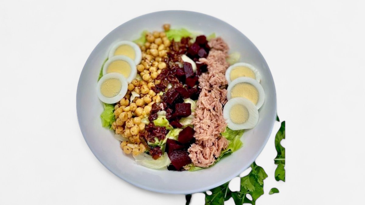 Mix salátů, pikantní cizrna, sušená rajčata, červená řepa, tuňák, vajíčko + dresink dle výběru. Hmotnost 425 g.