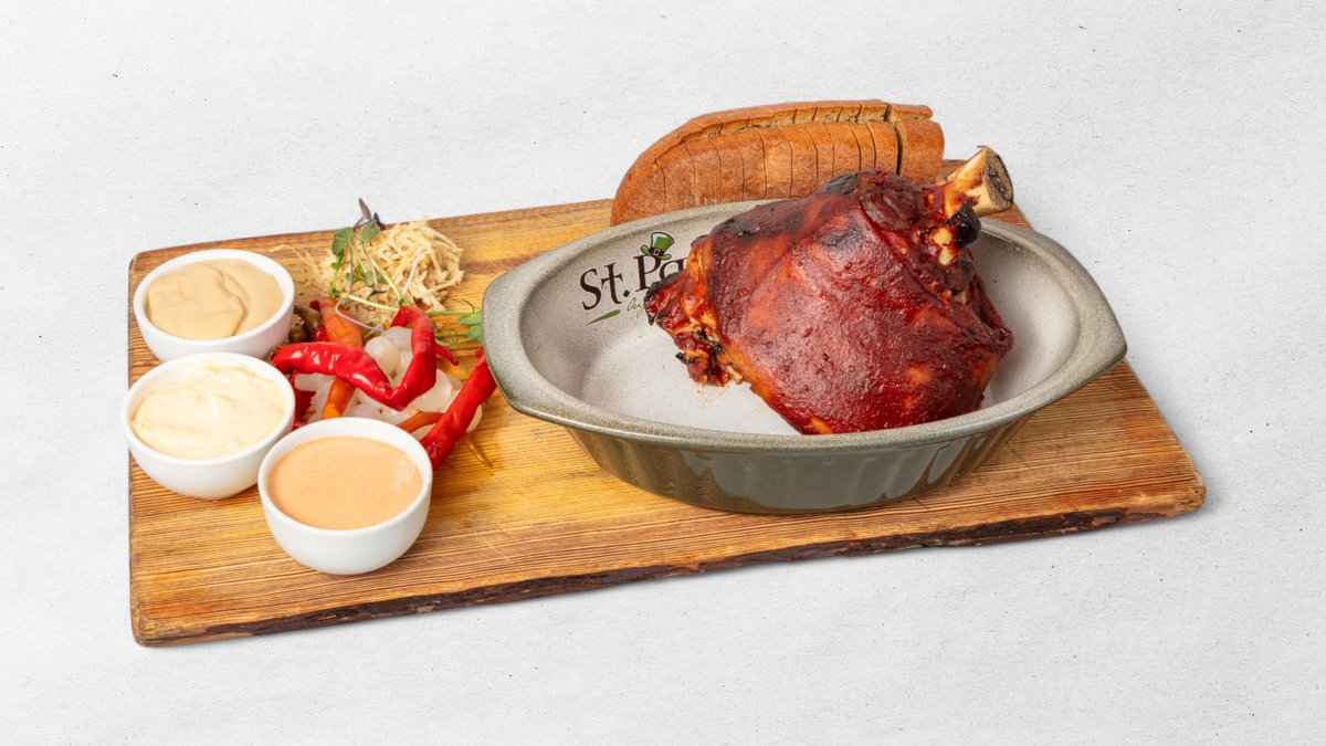 Pomalu pečené na rozmarýnu a česneku, podávané se šťouchanými bramborami, listovým špenátem a terčíky dijónské hořčice, 350 g.