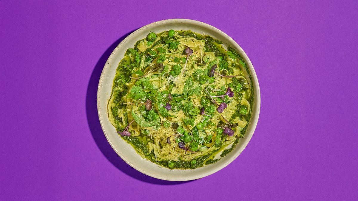 těstoviny z Čerstvé pasty, hrášková smetanová omáčka, baby špenát, bylinkové pesto, ovčí gouda