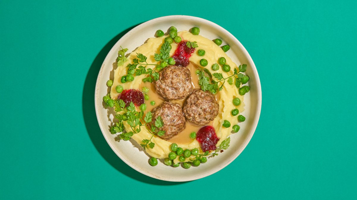 maso z Vojenic, máslová bramborová kaše, silná omáčka, hrášek, brusinky
