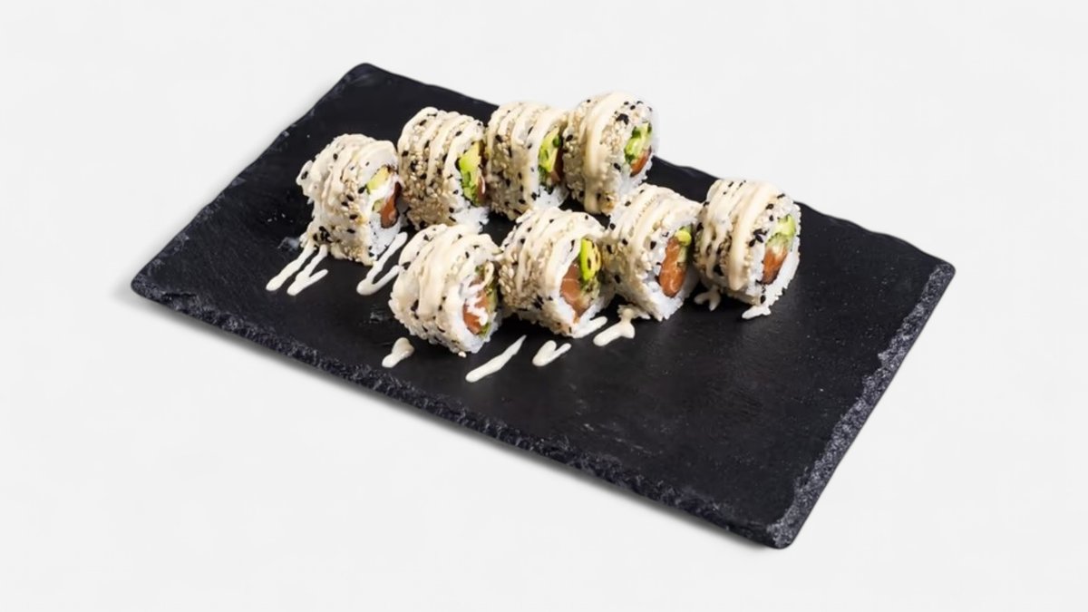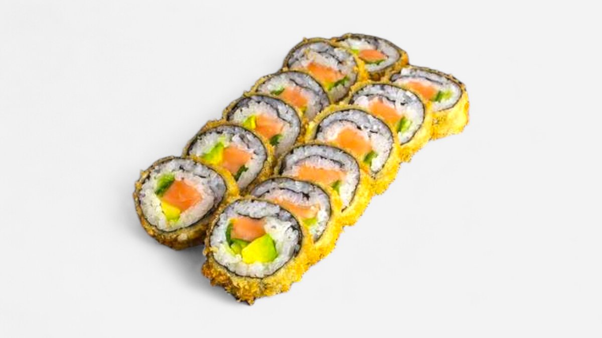 Sushi s lososem, avokádem a okurkou obalené v tempuře, podáváné s teriyaki omáčkou 8ks
