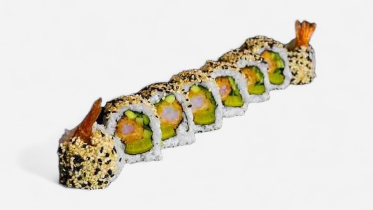Sushi se smaženou krevetou, okurkou a nakládanou ředkví, obalené v sezamu 8ks