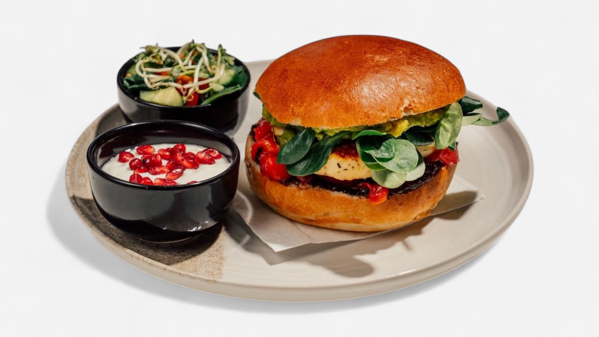 grilovaný sýr halloumi v křupavé bulce, pečené červené papriky, cibulové chutney, avokádo, jogurtový dip, malý zeleninový salát
