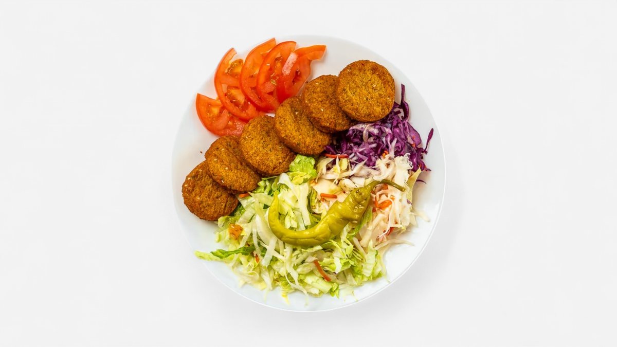 smažené cizrnové kuličky, čerstvá zelenina a omáčky, turecký chléb