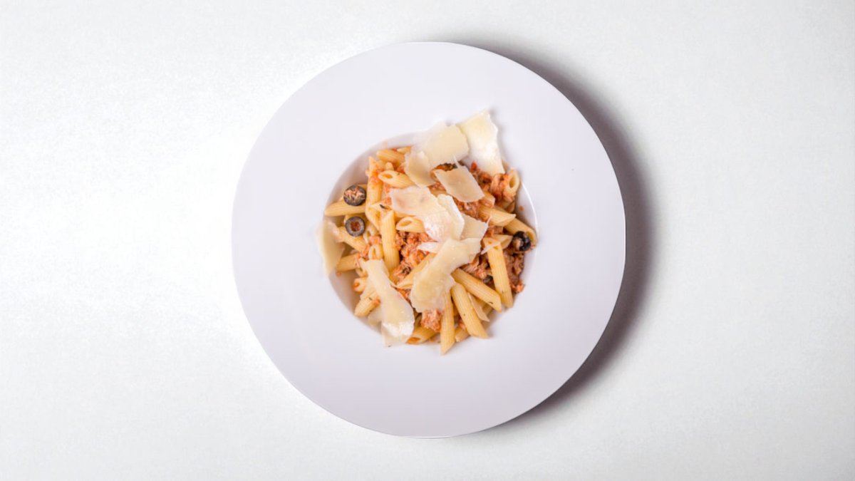 tuňák, rajč. sugo, sýr parmaz. typu, černé olivy