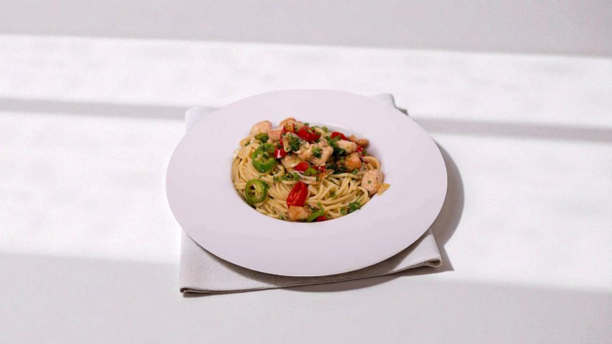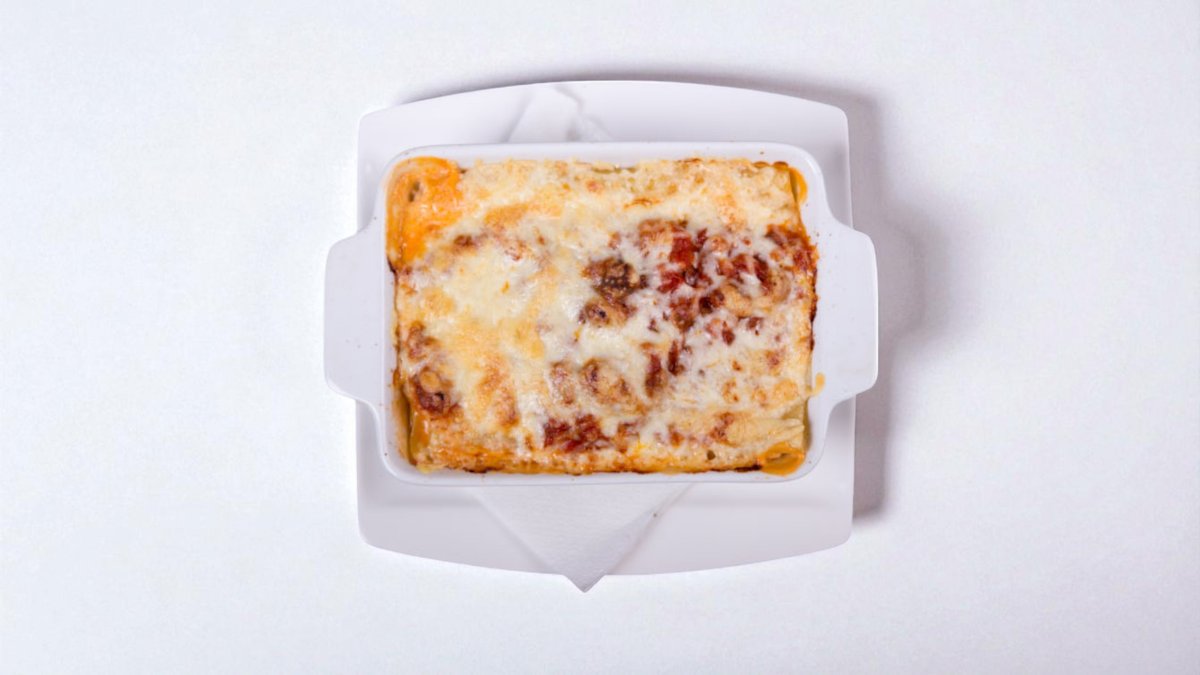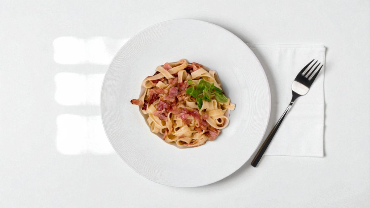široké nudle, rajčatové sugo, česnek, cibule, feferony, anglická slanina, parmazán