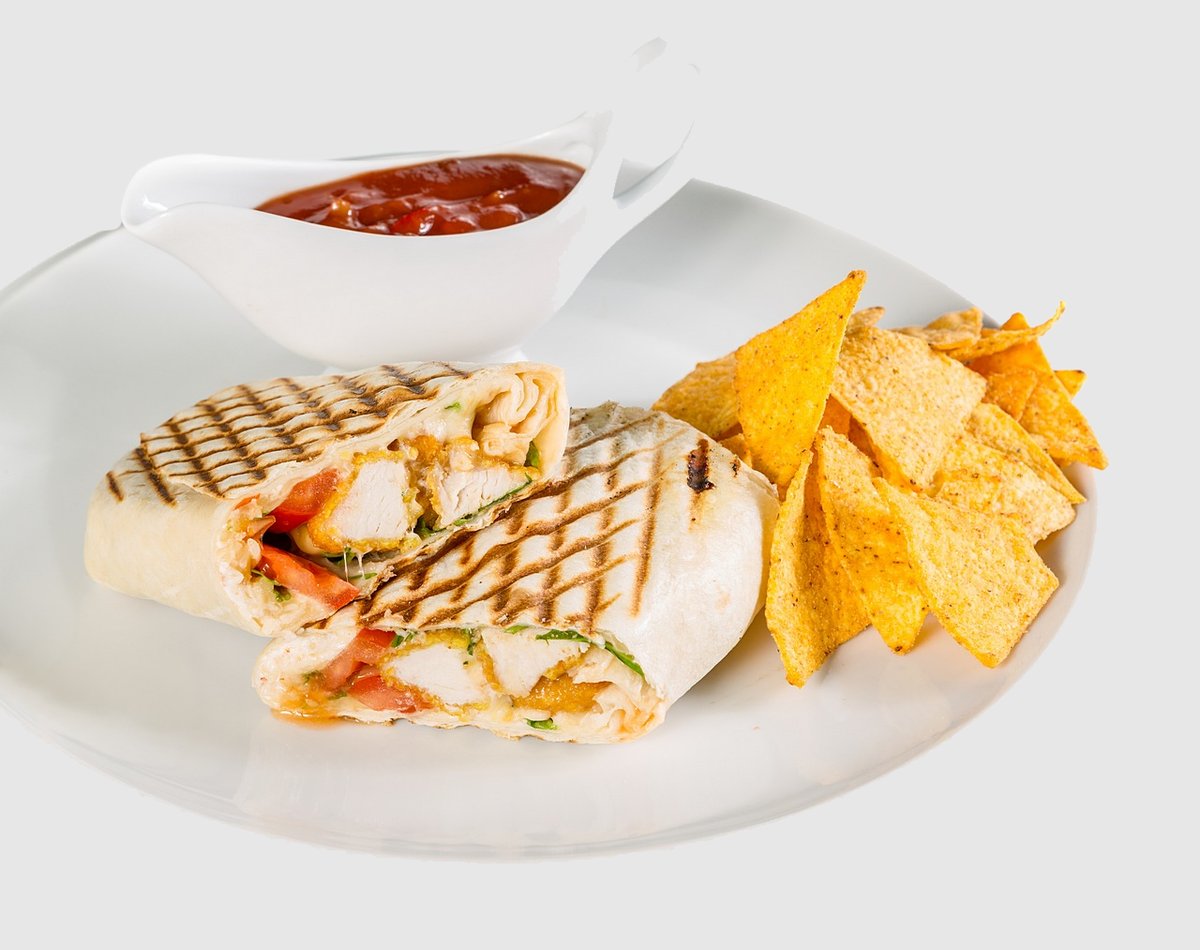 slanina, sýr, čedar, čerstvá paprika, grilovaná kuřecí prsa, krém z černých fazolí ledový salát, salsa mexicana