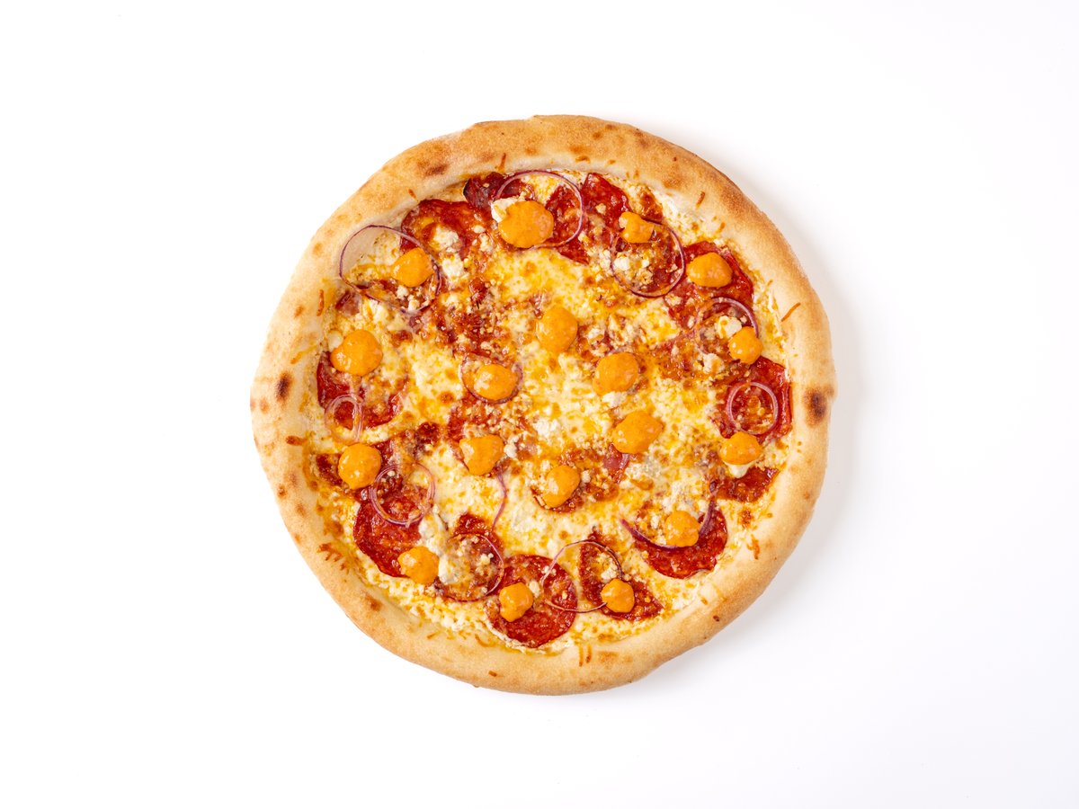 Bílý základ, mozzarella, salám, chorizo, cibule, mix sýrů (eidam a cheddar), balkánský sýr, King’s dip