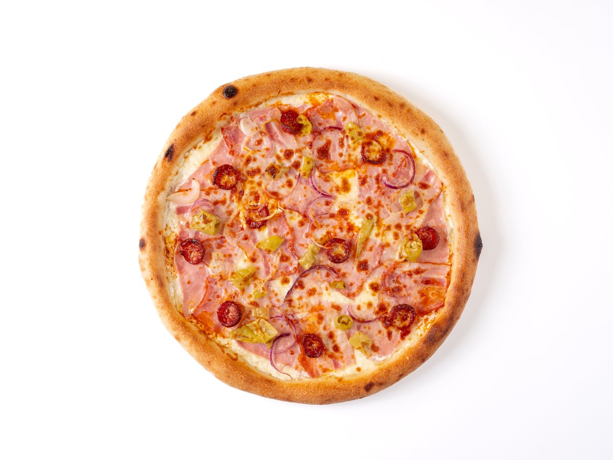 Bílý základ, rajčatové sugo, mozzarella, slanina, salám, klobása maďarská, cibule, paprika, kukuřice, chilli, jalapeňo