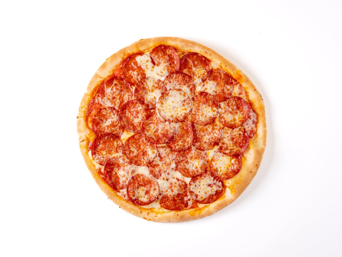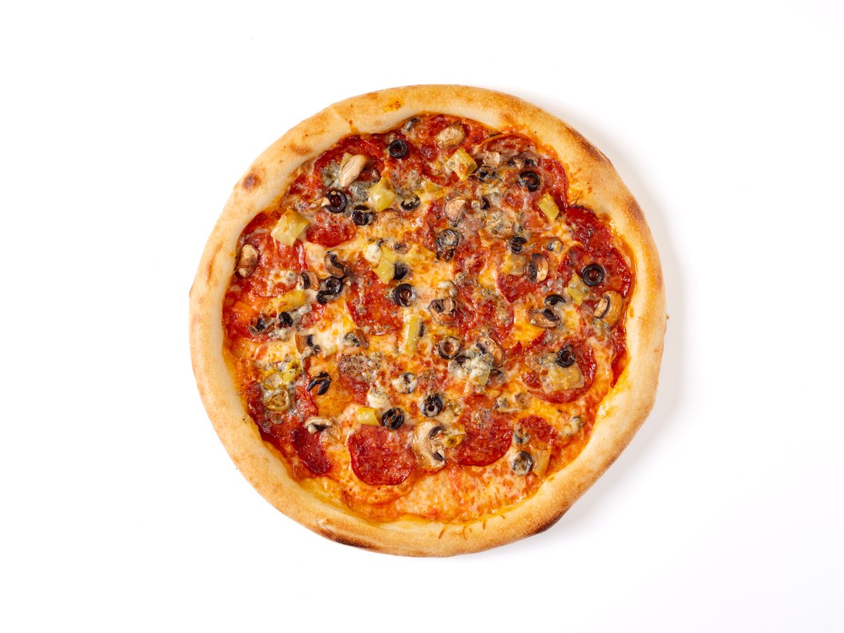Rajčatové sugo, mozzarella, salám, chorizo, žampiony, olivy, beraní rohy, niva