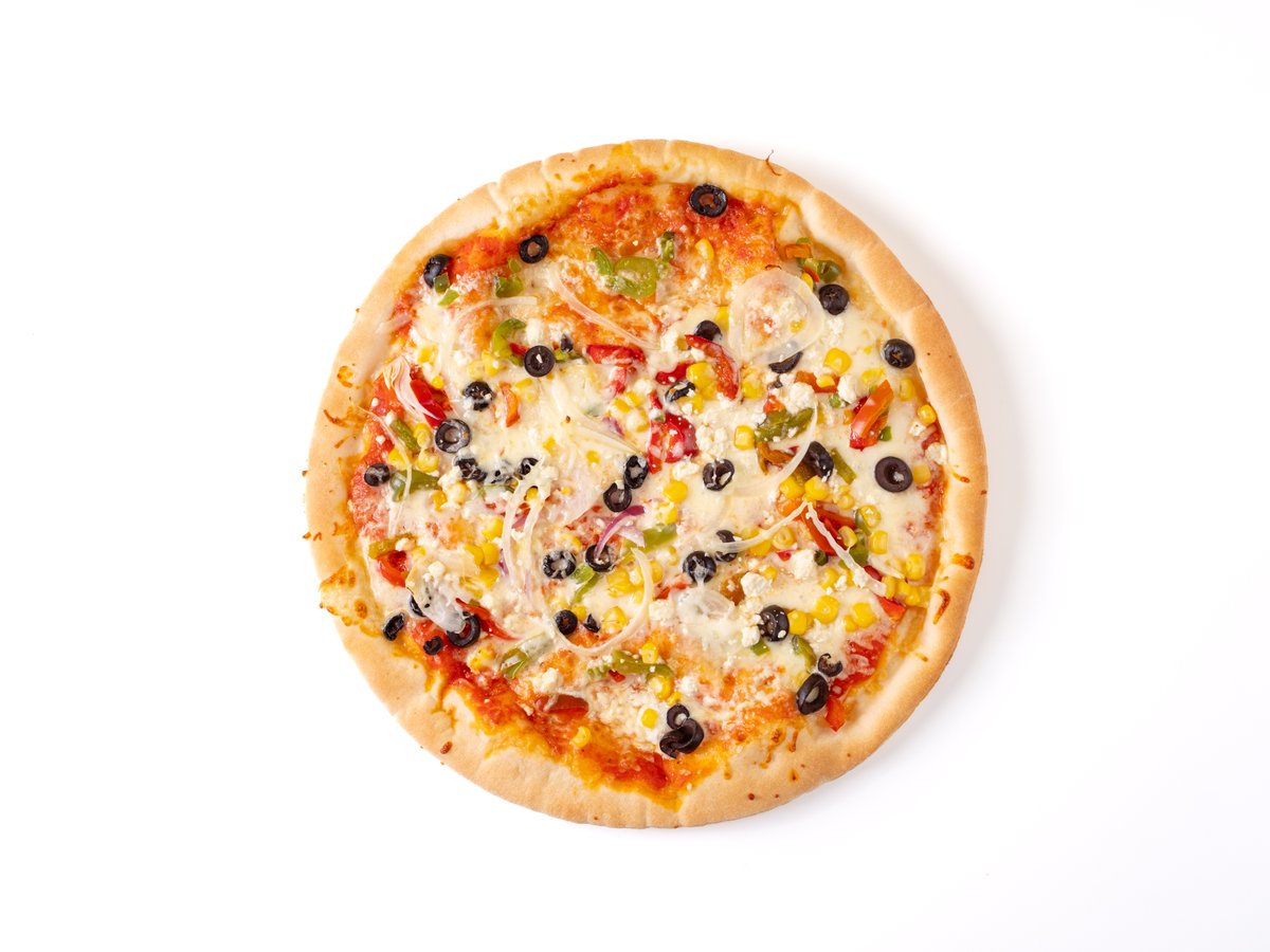 Bílý základ, rajčatové sugo, mozzarella, cibule, paprika, kukuřice, balkánský sýr, olivy