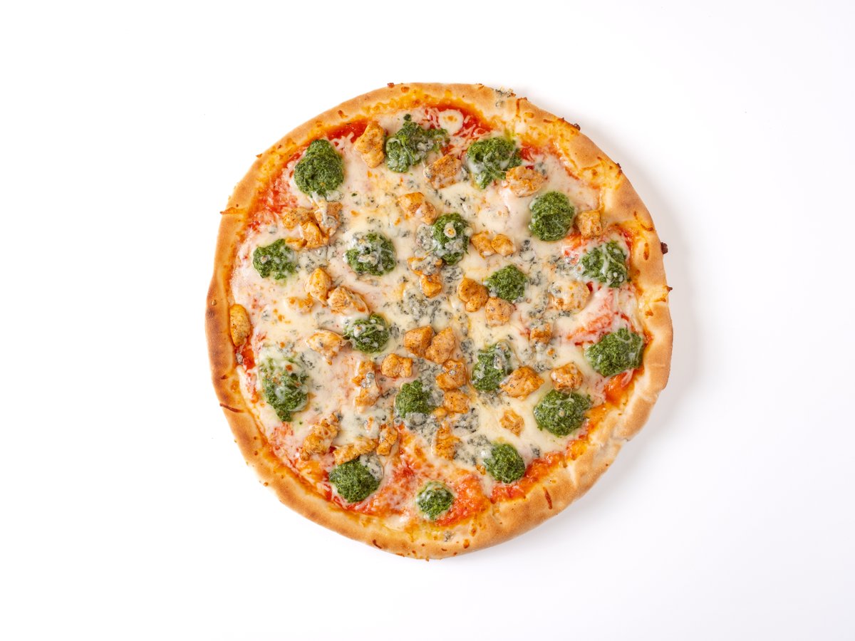 Rajčatové sugo, mozzarella, kuřecí maso, špenát, niva