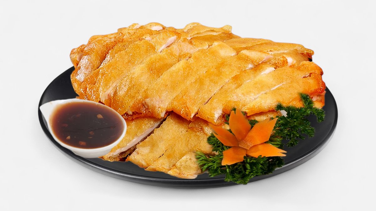 smažená rolka plněná lososem, sýrem Philadelphia, okurkou, krab pálivá omáčka a teriyaky omáčka