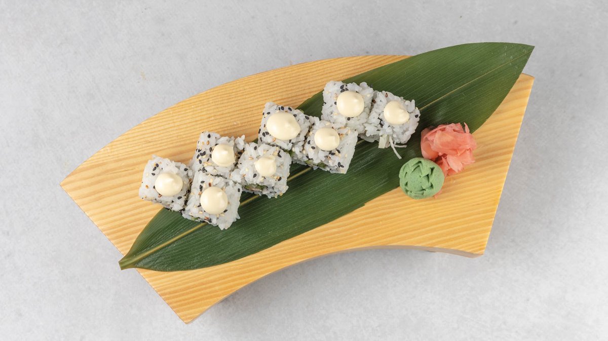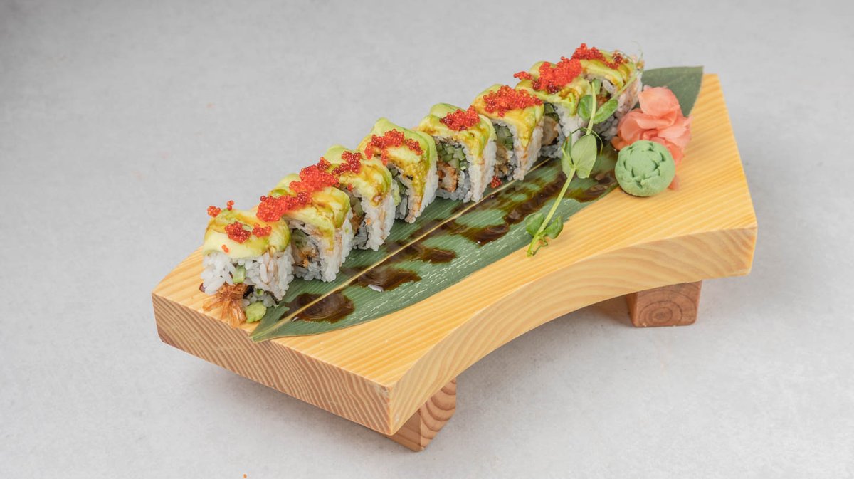 úhoř, krabí tyčinky, avokádo, okurky, smažené cibule, teriyaki, krém