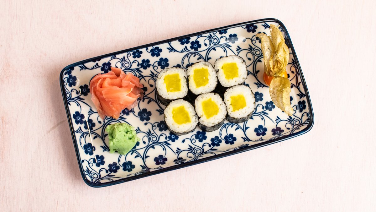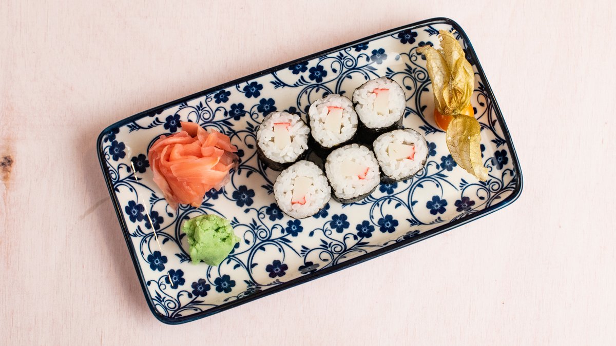 6ks futomaki krevety, 8ks uramaki tobiko losos, 8ks maki avokádo