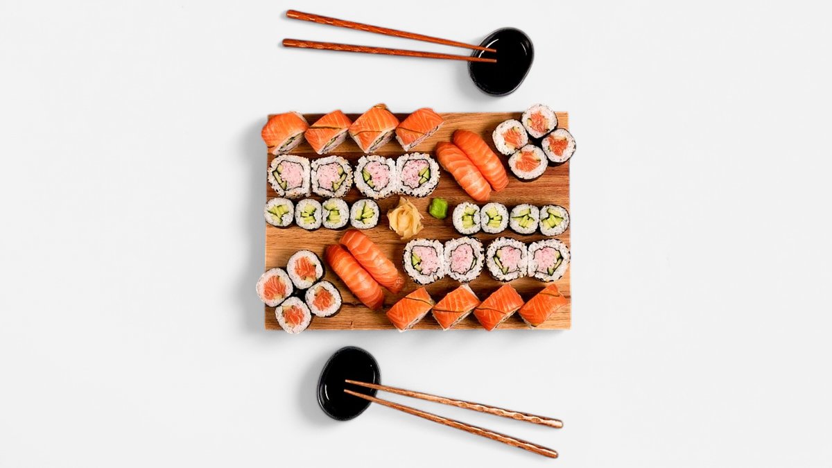 8ks maki losos, 8ks maki avokádo, 2ks nigiri losos, 2ks nigiri tuňák, 2ks nigiri krevety, 5ks futomaki krabí, 6ks smažené futomaki losos, 8ks uramaki tobiko losos, 8ks uramaki losos