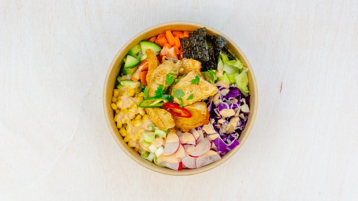 rýže, kuřecí, ledový salát, mrkev, okurka, kukuřice, avokádo, hrášek, teriyaki omáčka, majonéza, sezam