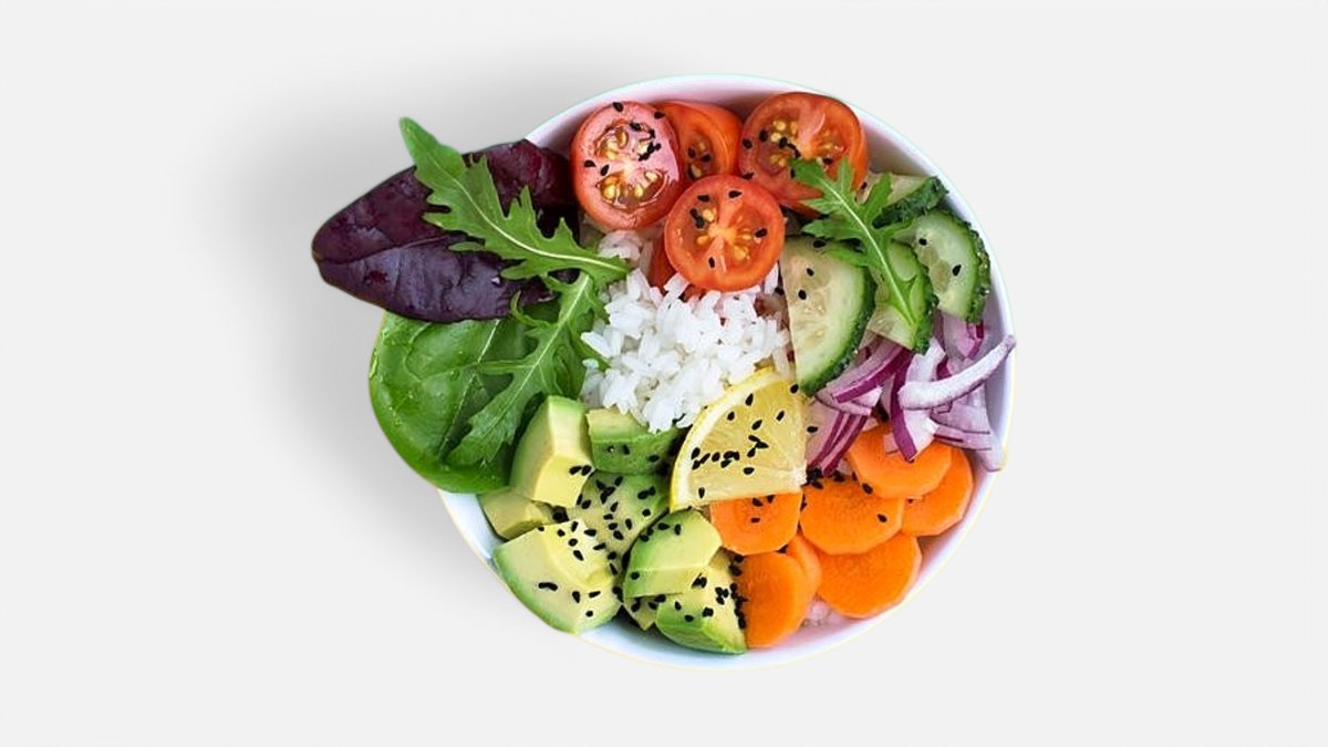 rýže, ledový salát, mrkev, okurka, kukuřice, avokádo, hrášek, teriyaki omáčka, majonéza, sezam