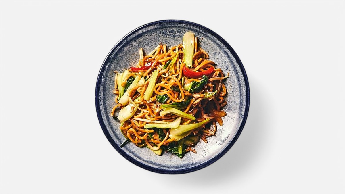 rýžové nudle s grilovaným vepřovým masem, zeleninou a s omáčkou