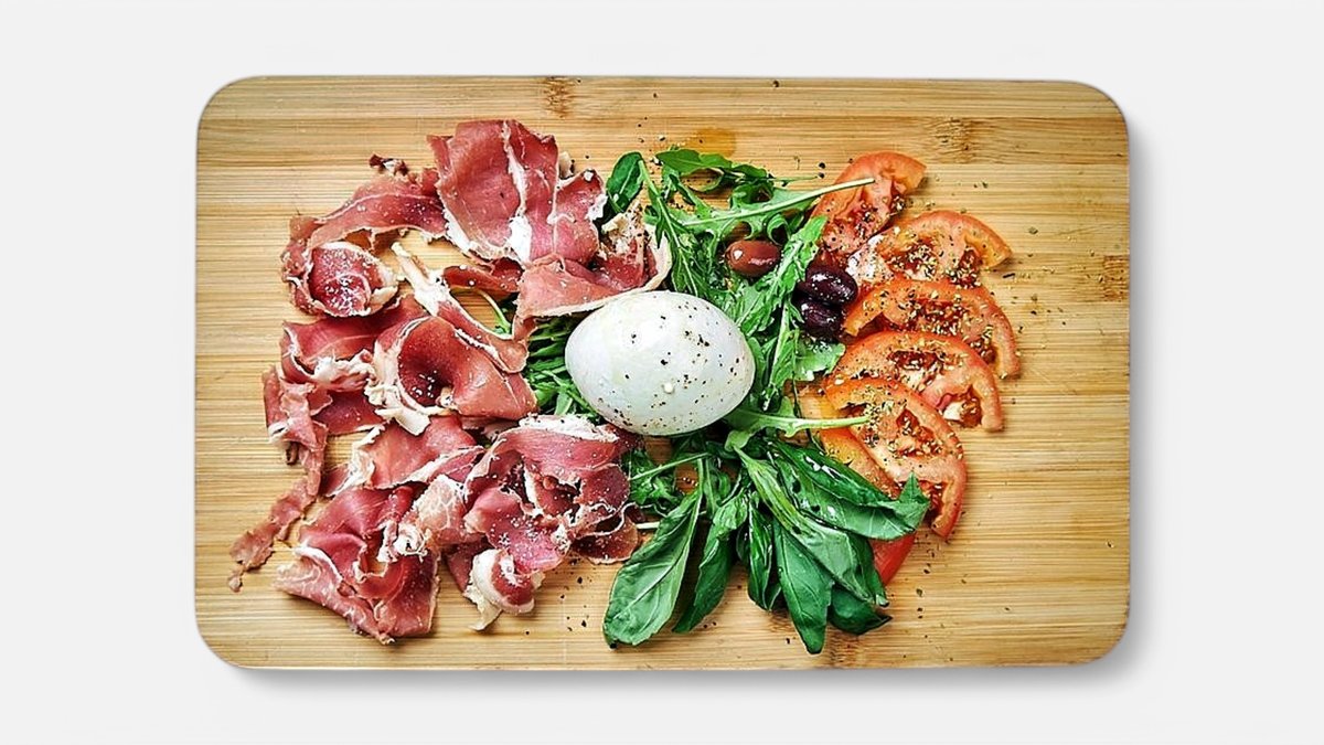čerstvý sýr burrata, parmská šunka, rukola, bazalka