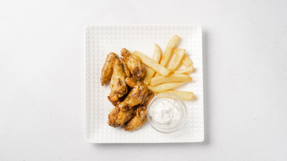 400g kuřecí křídla marinovaná v bbq omáčce s hranolky a česnekovým dipem - 6,7,10