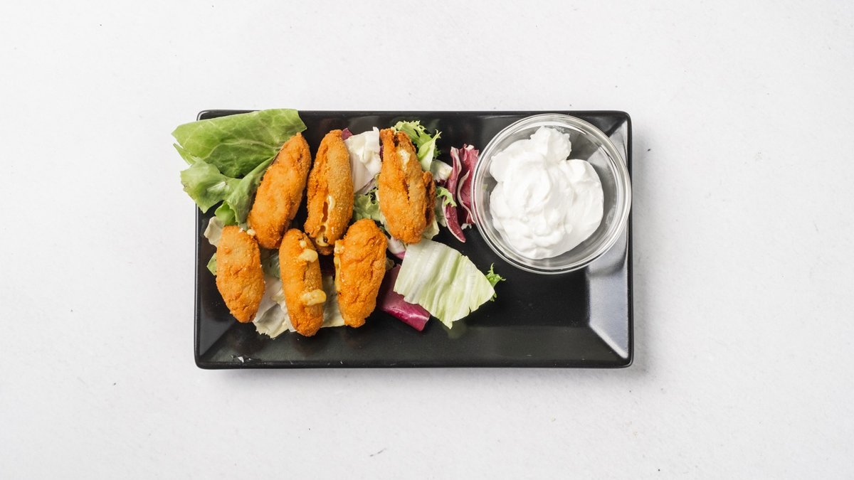 pikantní smažené sýrové kuličky, zakysaná smetana