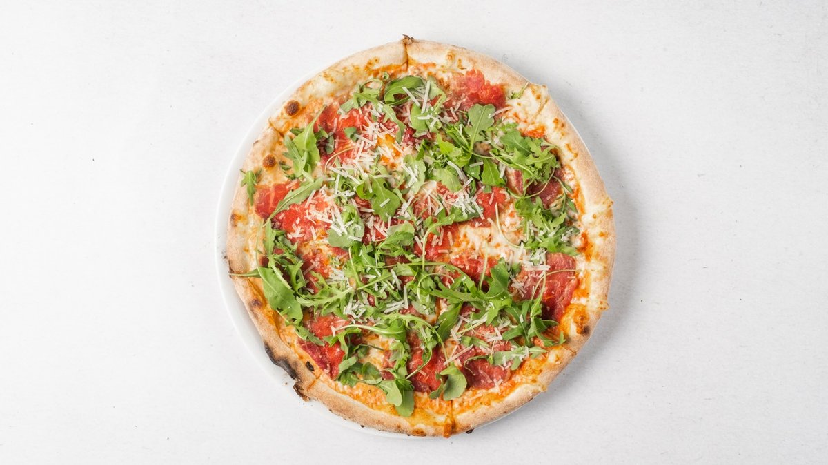 sugo, smetana, mozzarella, plátky svíčkové, rukola, grana padano - 1,3,6,7,12