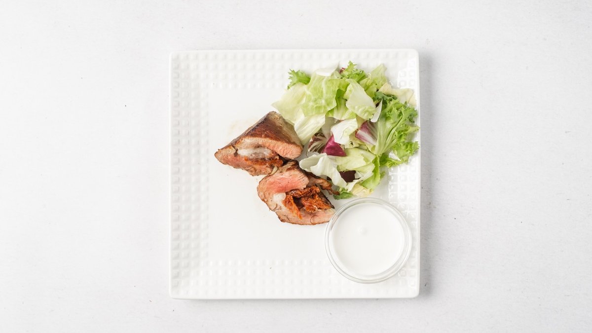 200g vepřová panenka plněná sušenými rajčaty a pancettou, česneková omáčka - 7