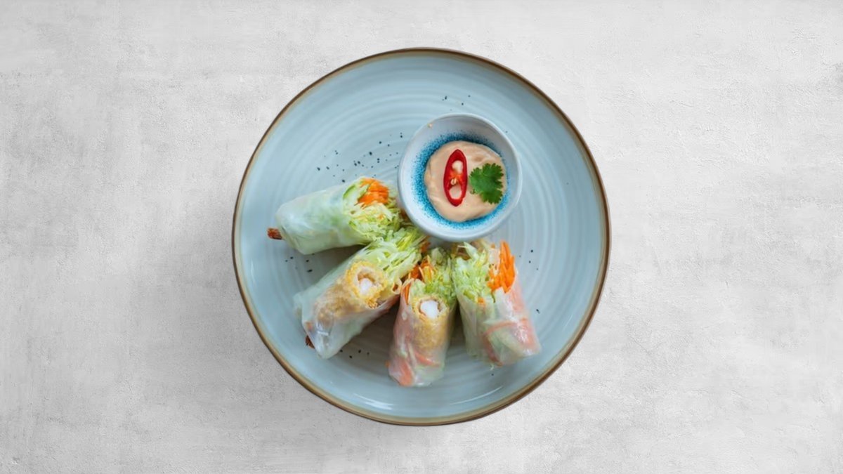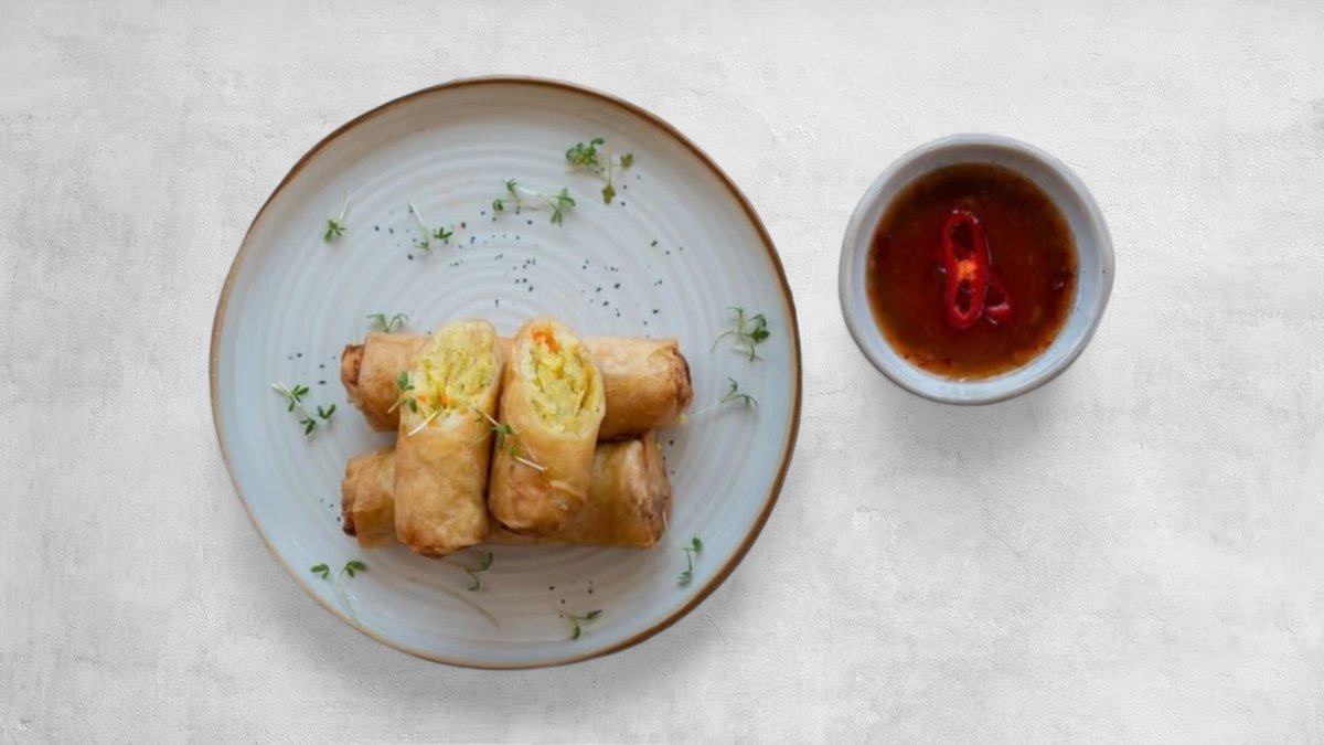 domácí thajské zeleninové závitky se skleněnými nudlemi a kurkumou, podáváme s omáčkou relish