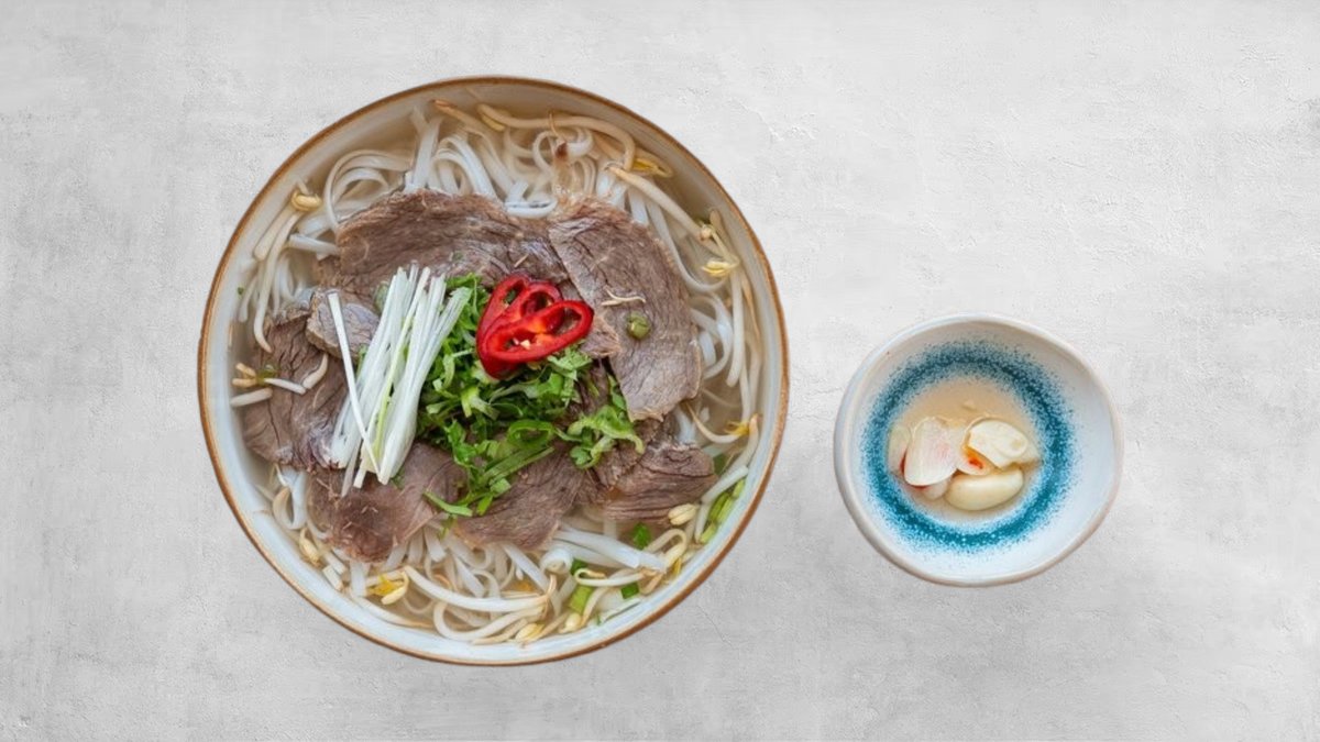 Bún bò Huế –Slavná hovězí polévka z Huế s aromatickým vývarem jemnoucitronovou trávou, mírnou pikantností, podávaná s rýžovými nudlemihovězím masem, vepřovým kolenem a. čerstvouzeleninou.