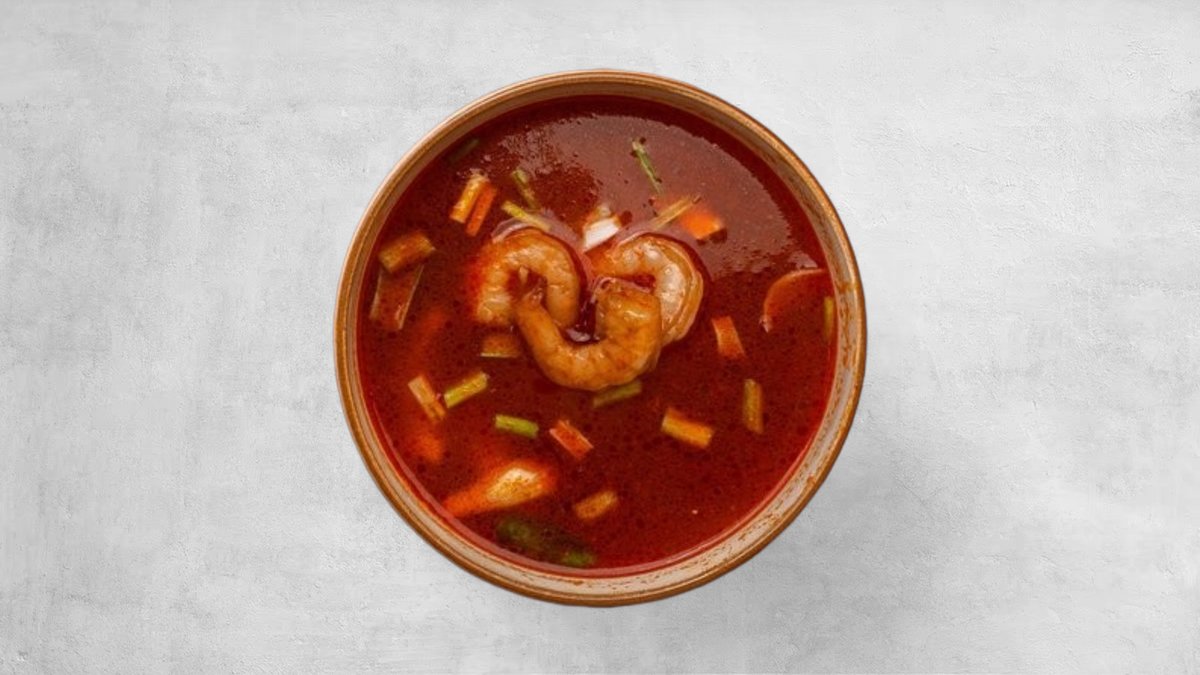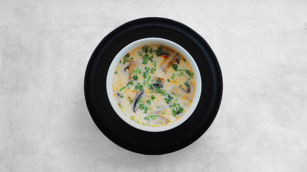 Tom Kha Kai tradiční thajská polévka, která kombinuje krémovou kokosovou chuť s aromatickými bylinkami a lehce kyselou příchutí. Žampiony,červená cibule, citronová tráva, kokosové mléko