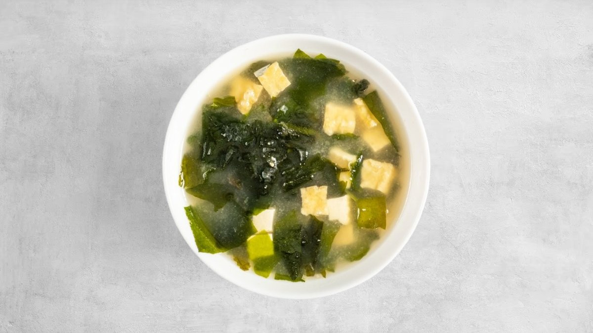 japonská polévka z fermentované pasty podávaná s hedvábným tofu a mořskými řasy (a lososem-varianta s lososem)