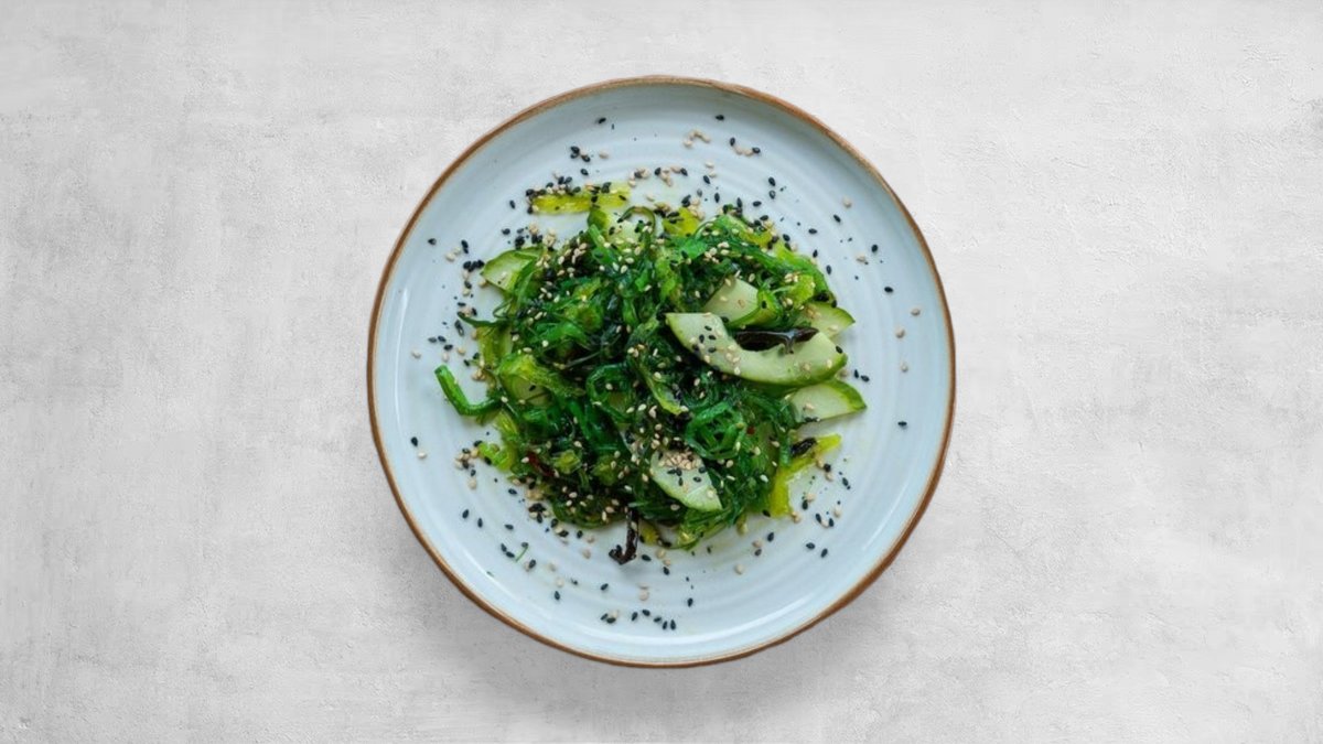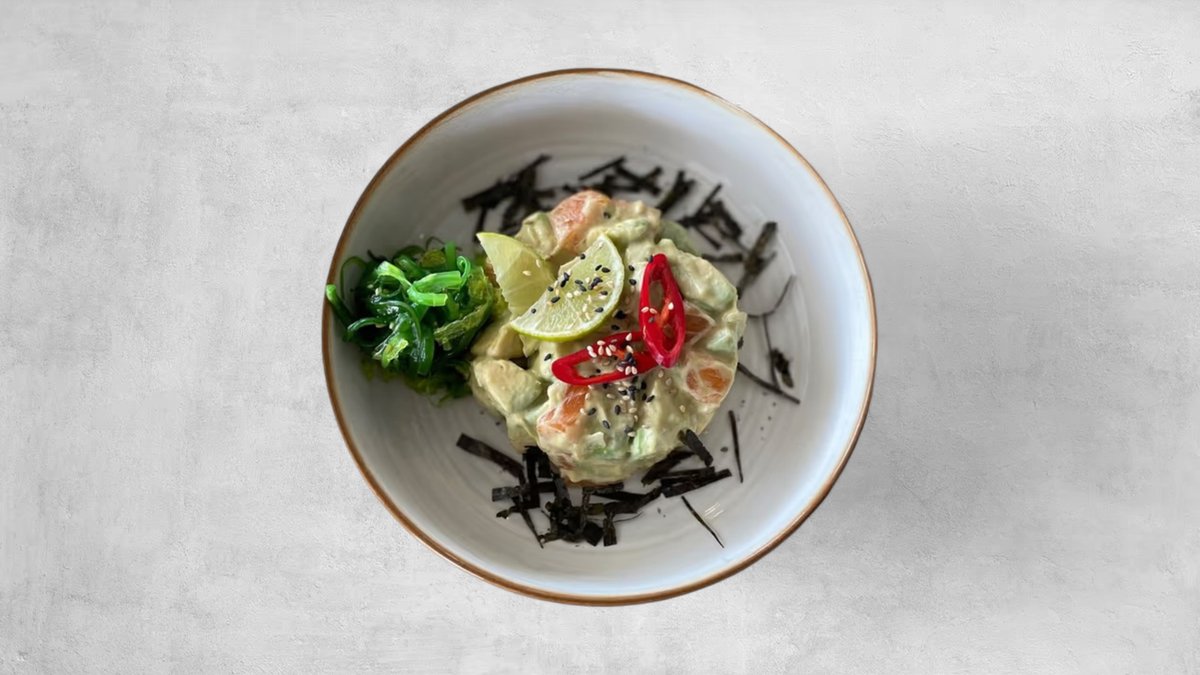 japonský salát Avokádo, ledový salát, japonská majonéza, wasabi, goma wakame, na výběr čerstvý losos/krevety/čerstvý tuňák