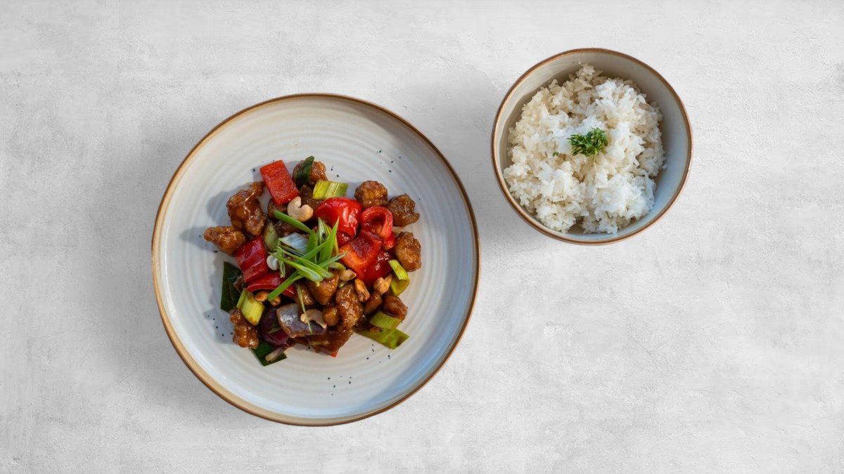 originální kung pao-šťavnaté kousky z kuřecího prsa v omáčce s cibulí a pórkem, kešu a arašídy, jemně pikantní. Podáváme s rýží a velmi doporučujeme ochutnat
