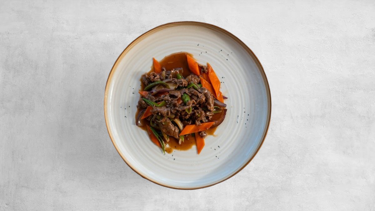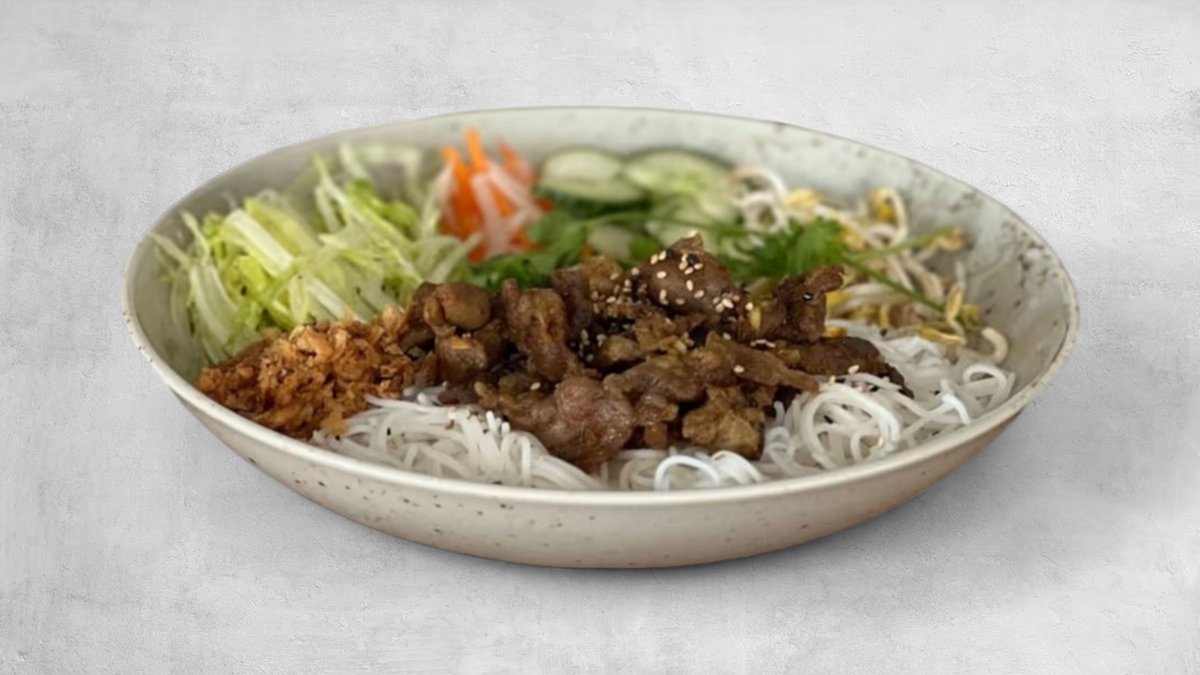 tradiční vietnamský nudlový salát s hovězí roštěnou, čerstvou a nakládanou zeleninou, sladkokyselá zálivka, arašídy, smažená cibulka