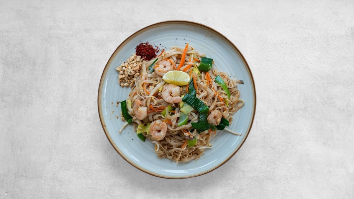 nejznámější thajské smažené nudle se zeleninou, phad thai omáčkou, výběrem masa, podáváme s limetou, sušenými chilli vločkami, arašídy