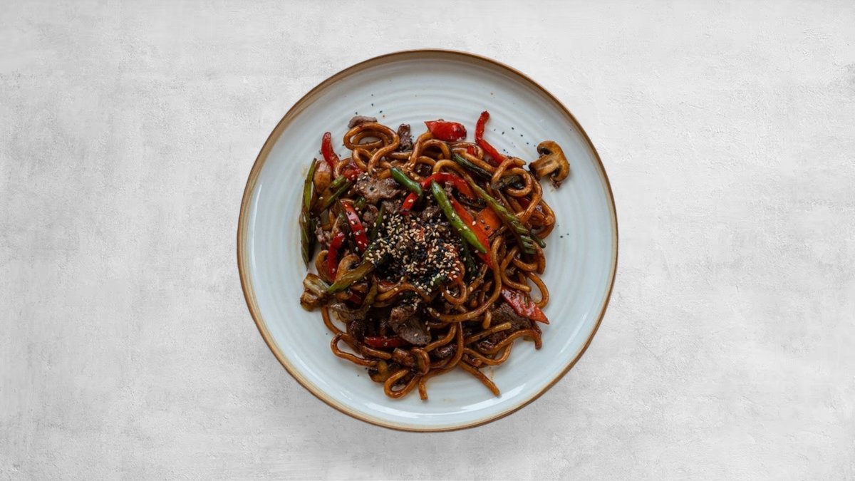 smažené japonské nudle udon s křupavou zeleninou a variací masa a sezamovým olejem