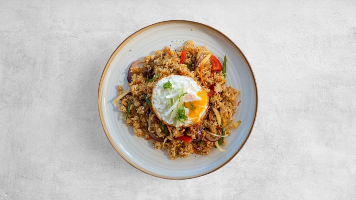 indonéská smažená pikantní rýže s variací masa, zeleninou a sázeným vejcem