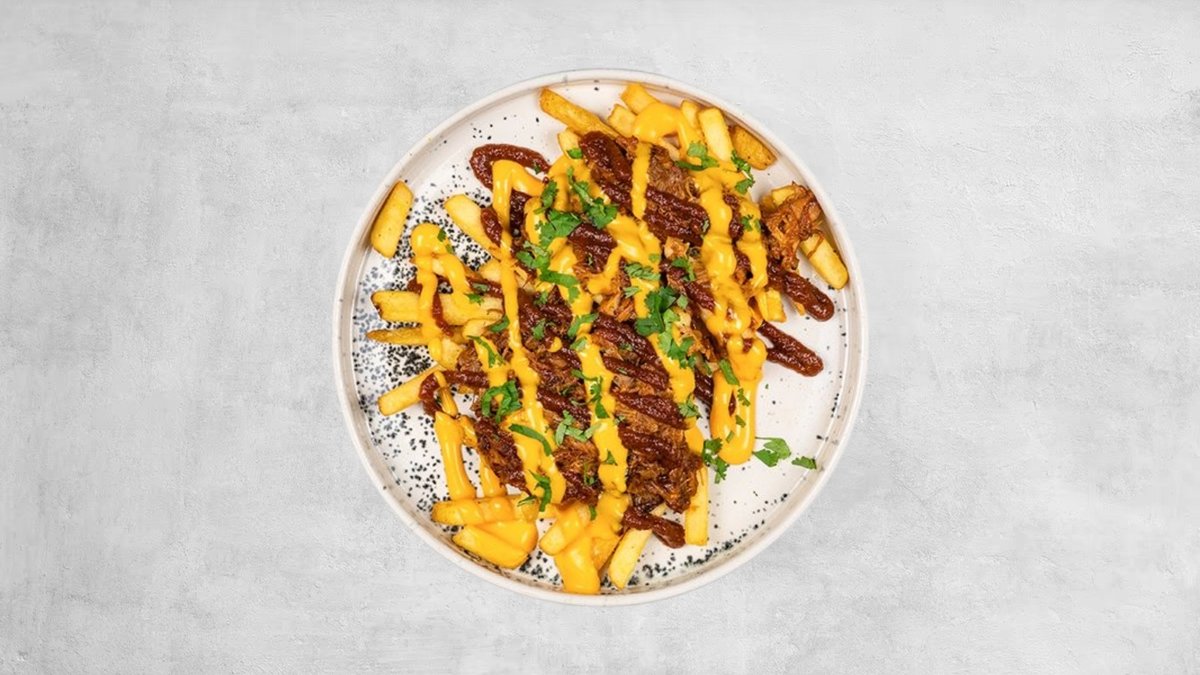 2 druhy hranolek zapečené s trhaným masem a sýrem: batátové a klasické hranolky zapečené s trhaným masem a sýrem, podáváme s kečupem nebo chilli majonézou